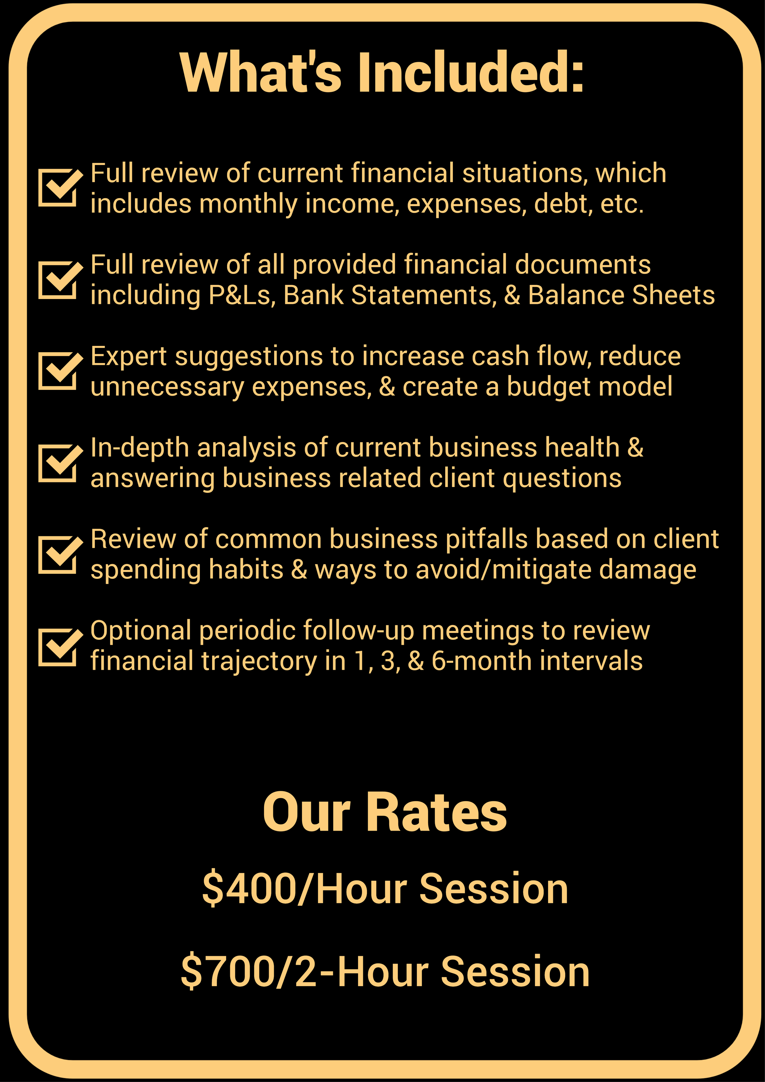 Say goodbye to unpredictable costs with our firm’s flat-rate billing system. Every single one of our services, whether it’s tax filing, accounting, or custom projects follow a flat-rate fee system. What that means for you is easy budgeting every month, knowing exactly how much your invoice will be.